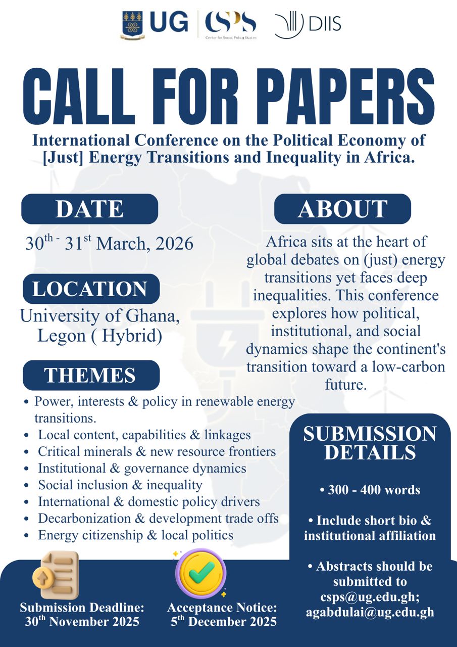 Published on: Friday November 7, 2025 SHARE Call for Conference Papers - International Conference on the Political Economy of Energy Transition and Inequality in Africa CLICK HERE FOR MORE DETAILS