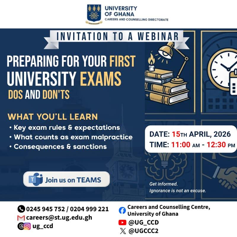 The University of Ghana Careers and Counselling Directorate (UGCCD) offers various psycho-social counselling services including preventive counselling, academic counselling, vocational counselling, relationship counselling, grief counselling, behavioural counselling, psychometric assessment, family therapy, psycho-therapy, assessment and management of learning disorders, assessment and management of Obsessive-Compulsive Disorders, stress management, treatment and management of depression, psychiatric assessment and treatment, just to mention a few.