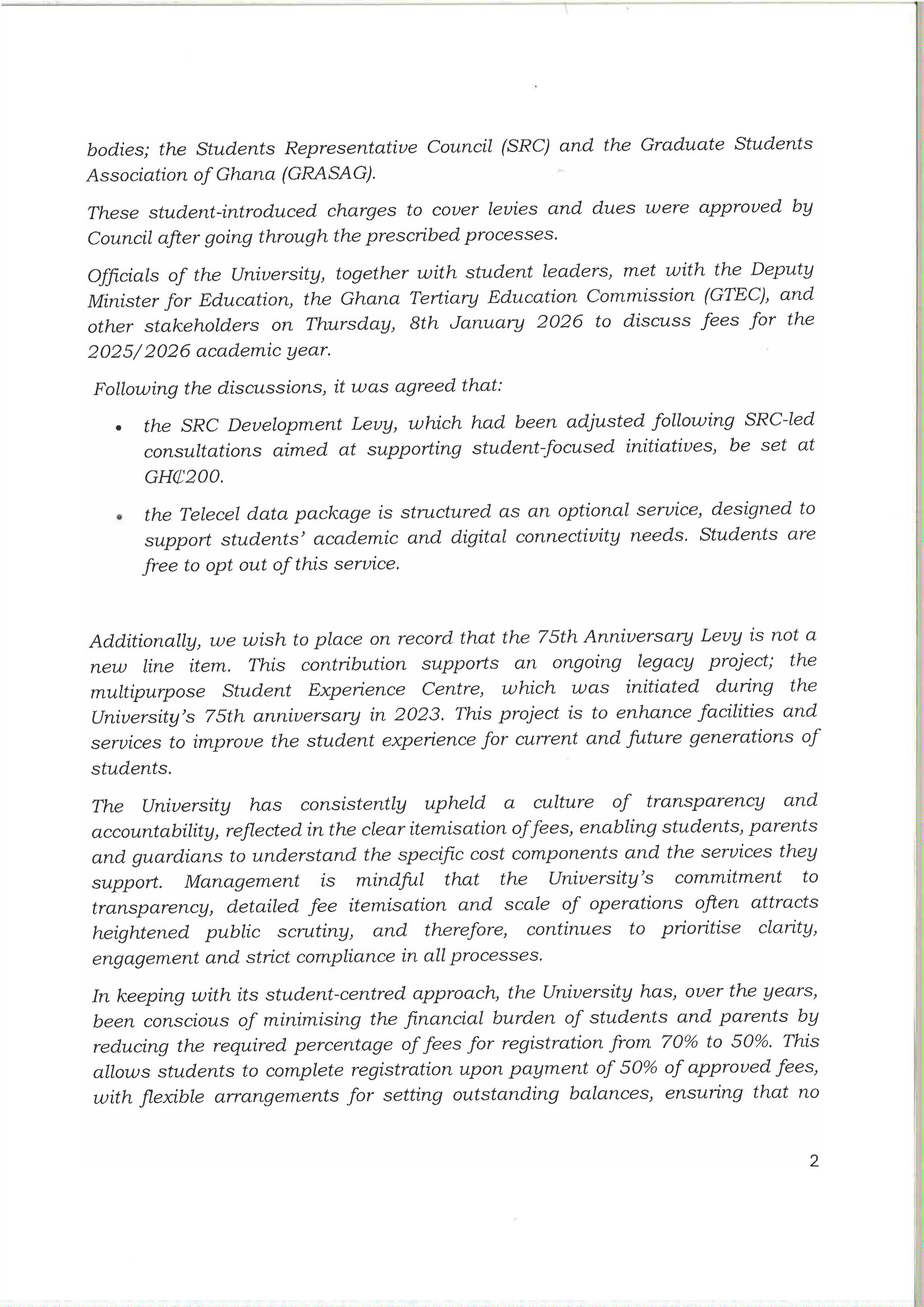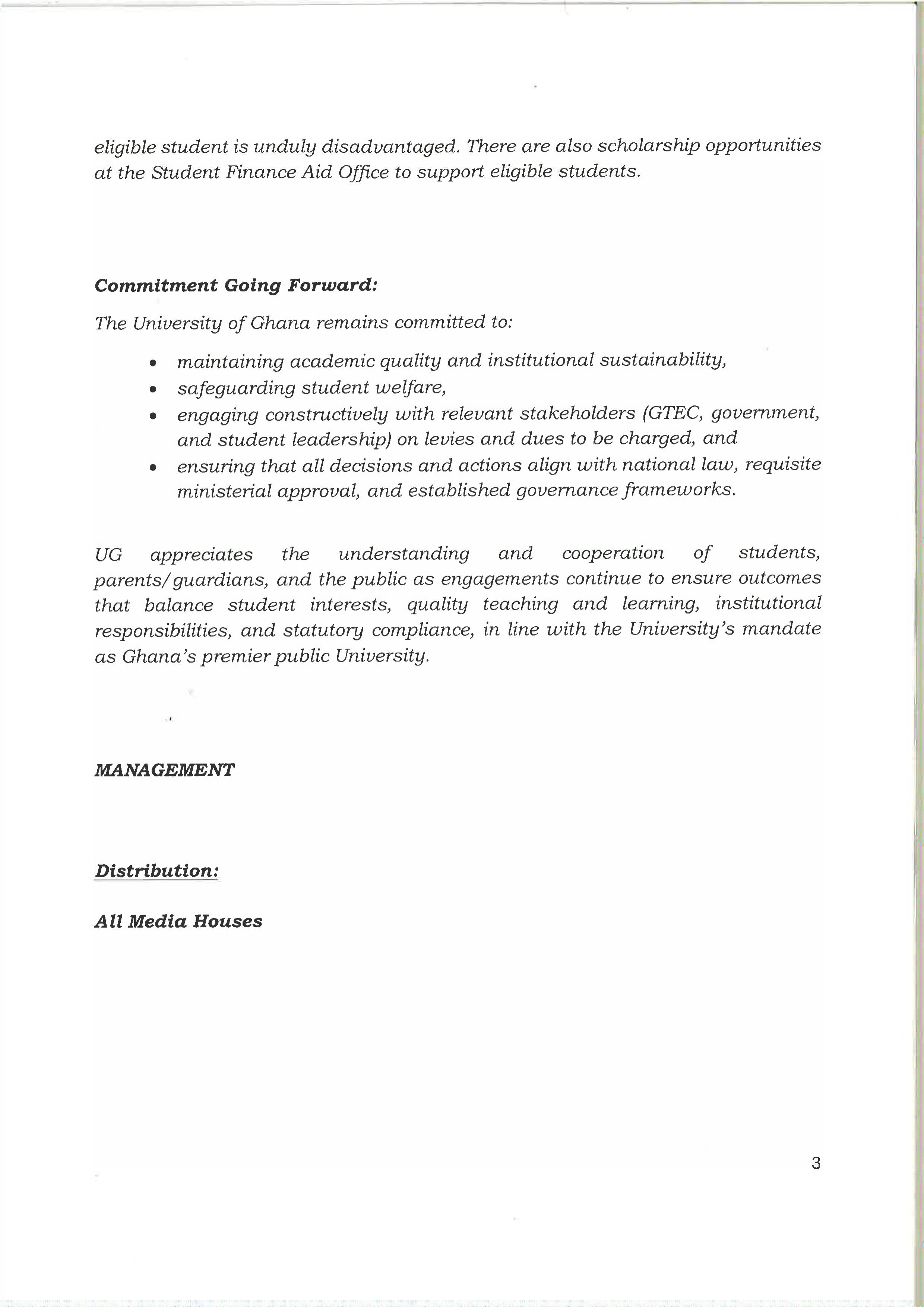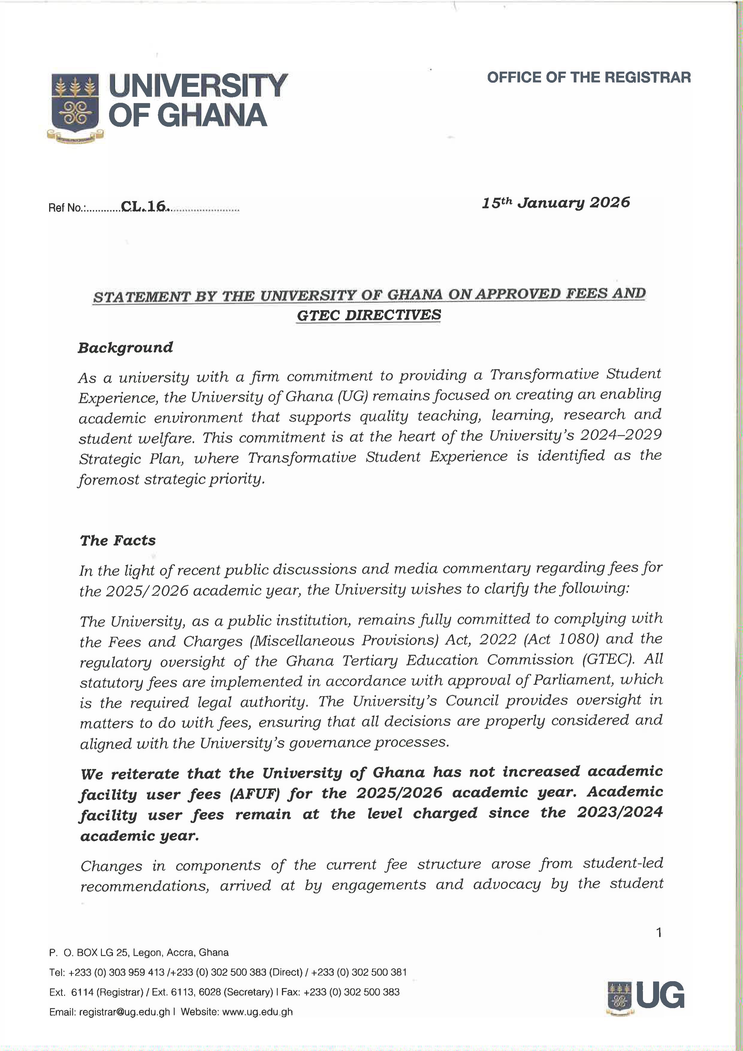 STATEMENT BY THE UNIVERSITY OF GHANA ON APPROVED FEES AND GTEC DIRECTIVES
