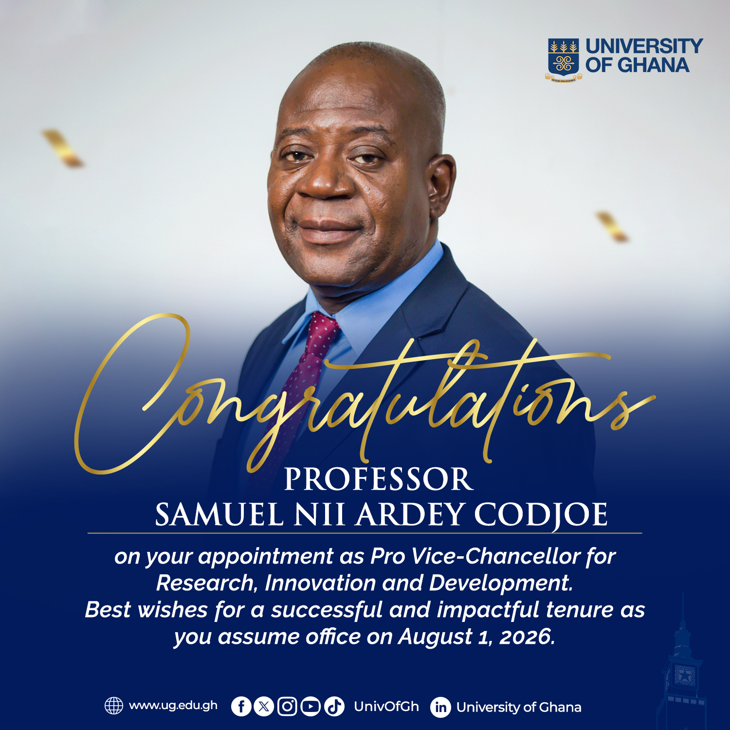 The University of Ghana Governing Council has appointed Prof. Samuel Nii Ardey Codjoe as Pro Vice-Chancellor for Research, Innovation and Development, effective August 1.